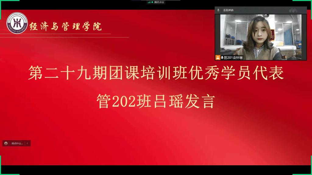 第二十九期优秀学员管200班吕瑶和第三十期培训学员金融212班牛睿豪分别作代表发言。开班仪式后,校团委荆霄作题为《我的青春我的团——做新时代优秀共青团员》的团课第一讲,聚焦认识我的团、清楚我的身份、了解我的组织、明确我的方向四方面内容,解读了共青团的组织性质、组成成员、基本任务等重要内容,激励广大团员坚定理想信念,刻苦学习本领,带头争创佳绩,带头弘扬清风,争做优秀的共青团员。