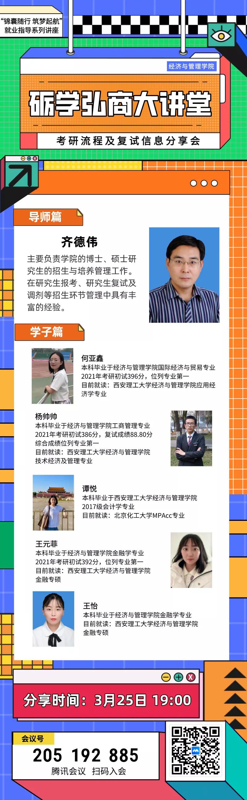 齐德伟讲到,复试前要对报考学科、学院导师和国家政策有一个充分的了解,同时要对复试内容有充足的准备,才能胸有成竹地应对考试。齐老师还列举了一些在面试时可能会出现的突发状况,给考生提供了一些应对方法,指出无论发生怎样的情况都不要慌张,有条不紊的处理好即可。此外,齐老师对考研的政策、目的、价值及毕业选择进行了简要介绍。杨帅帅和谭悦等五位学长学姐分别结合自身经历从自我介绍、专业课复习、联系老师、调剂信息、复试突发状况处理获取等角度详细的为大家提供复试指导。