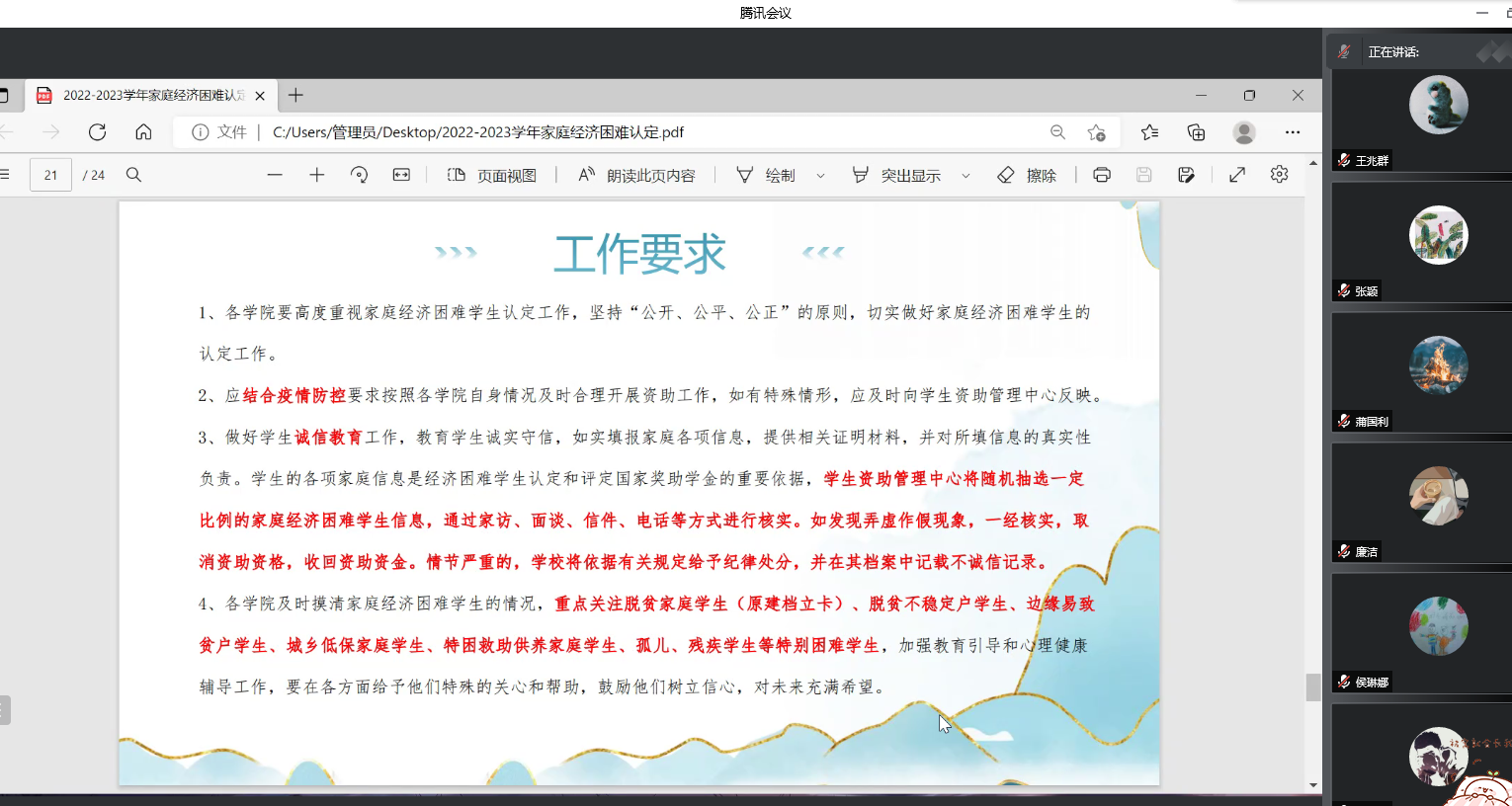 最后白华煜老师总结时强调,新生导师通过本次贫困认定过程要进一步了解本班学生家庭及个人情况,深入到学生中去,主动了解班级学生的学习生活情况、积极关注学生思想动态、家庭情况等;其他各年级导师疫情期间要关注重点学生,做好学生适应性管理工作、细化学生的培养管理、关注大四学生就业;引导学生构建自我职业规划并不断完善,提高学生培养质量,希望各位导师开拓工作思路,创新工作方法,使学院的本科生导师工作再上一个新的台阶。