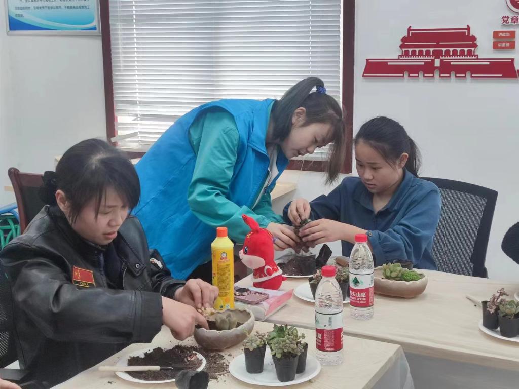 此次志愿者服务活动以感悟美好时节、凝聚巾帼力量为主题,志愿者负责活动的组织和开展,纸坊南村30余名社区女性与志愿者共同参与。活动开始,由当地村书记致辞,接着社区的村民们和五名学生一起欣赏了由纸坊南村社区村民带来的表演,有舞蹈《欢庆日子》、女声独唱《我爱你中国》、舞蹈《老两口学毛选》等,将活动现场氛围推向高潮。随后,大家跟随主持人李维同学一起完成了几场妇女健康知识有奖问答,韩滨帆同学带领大家进入多肉DIY种植环节。