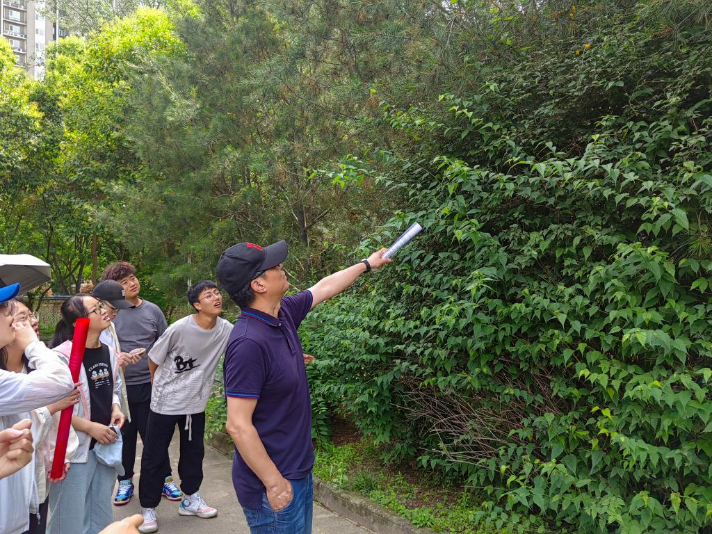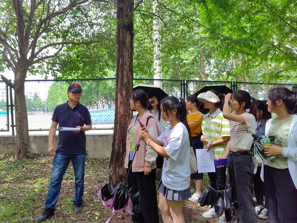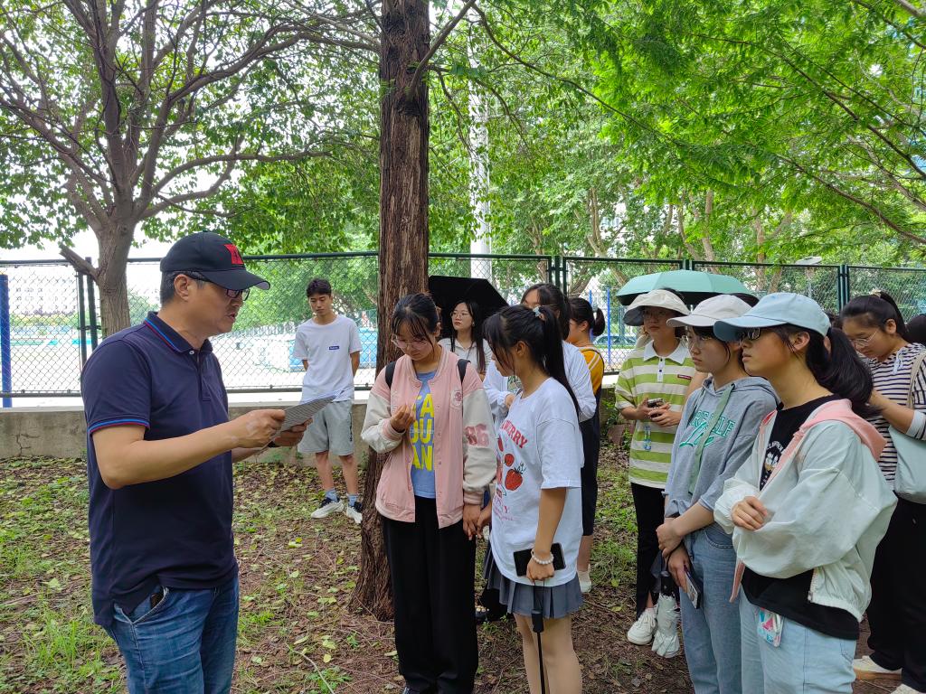 伴随着暮春午后的微微凉风,老师与同学们漫步在校园花草林木间,观察每一株植物的生长特点,欣赏自然之美。在老师幽默风趣的讲解中,同学们了解到校园内各类花草树木的生长习性及识别方法,在颇有趣味的历史故事中感受植物的“前世今生”,并于讲解过程中积极思考、与老师互动。活动过程中,任老师为同学们介绍了垂丝海棠、木瓜海棠等不同蔷薇科植物的辨识方法;通过观察不同种针叶林树木针叶的根数,判断生长习性;教11楼前由校友捐赠的灯台树,也因其独特的枝叶生长形态而格外珍贵;在操场旁的水杉林中,同学们了解到“活化石”——水杉生长环境的特殊性,老师为大家拓展讲解了这类树种的历史沿袭,为这类古老的植物蒙上一层“神秘的面纱”。在校园林荫道上种满的“二球悬铃木”——法国梧桐,是一球与三球悬铃木的杂交品种,与中国青桐不同,树形叶大荫浓,更为高大。同样,早在中国的《诗经》里就有关于梧桐的记载。在诗经,大雅的“卷阿”里,有一首诗写道:“凤凰鸣矣,于彼高冈。梧桐生矣,于彼朝阳。奉奉萋萋,雍雍嘴嘴。”进一步拓展了同学们的历史文学积累。