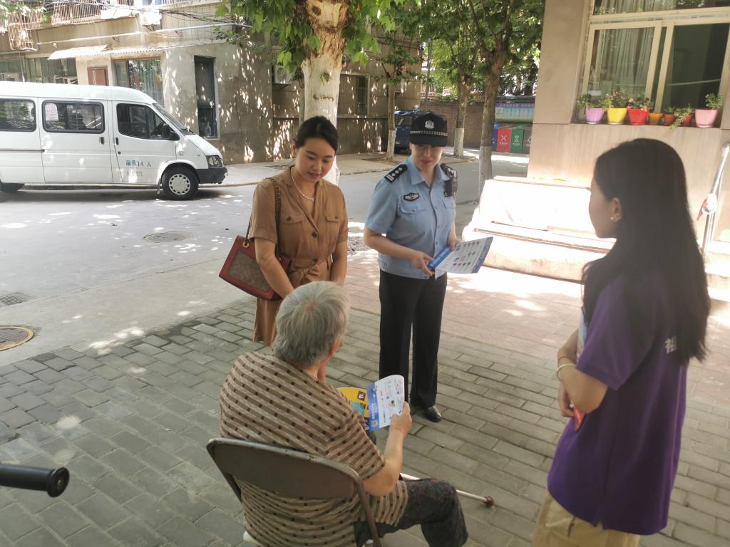 韩森寨派出所孙警官、曲江派出所张警官和实践队员一起赴咸宁中路313号院、曲江中和府沿街商铺、曲江创意谷、明珠汇博林、康桥边的院子等小区和商圈开展防范电信网络诈骗宣传实践活动。他们面向商户、顾客和小区居民发放反诈宣传彩页和折纸,在小区单元楼门口张贴反诈公告,协助社区群众下载安装国家反诈APP并开启拦截模式。重点向老年人群体讲解了“投资返利陷阱”“以房养老骗局”“免费旅游诈骗”等新型骗局的实施手段和套路特征,助力老年人提高防骗意识、强化反诈技能、安享幸福晚年。