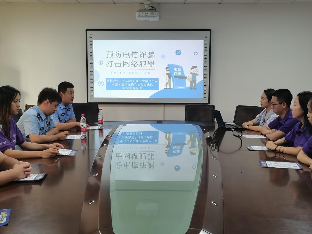 活动后,实践队与雁塔反诈中心杨颖警官一行在学院第二会议室座谈交流。双方一致同意继续加强合作力度,持续做好警校联动,动员号召更多青年志愿者加入“反诈联盟”大军。双方表示,将在现有工作基础上,积极创新反诈宣传方式,提高反诈宣传的精度和准度,筑牢反诈“心盾”。