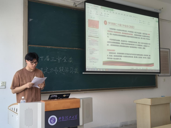 为深刻把握进一步全面深化改革的主题,学习贯彻党的二十届三中全会精神,把进一步全面深化改革的战略部署转化为推进中国式现代化的强大力量9月10日下午,yl8858永利集团管工系本科生党支部于教8-212开展党的二十届三中全会精神专题学习会,全体党员参加此次学习,会议由马培森主持。