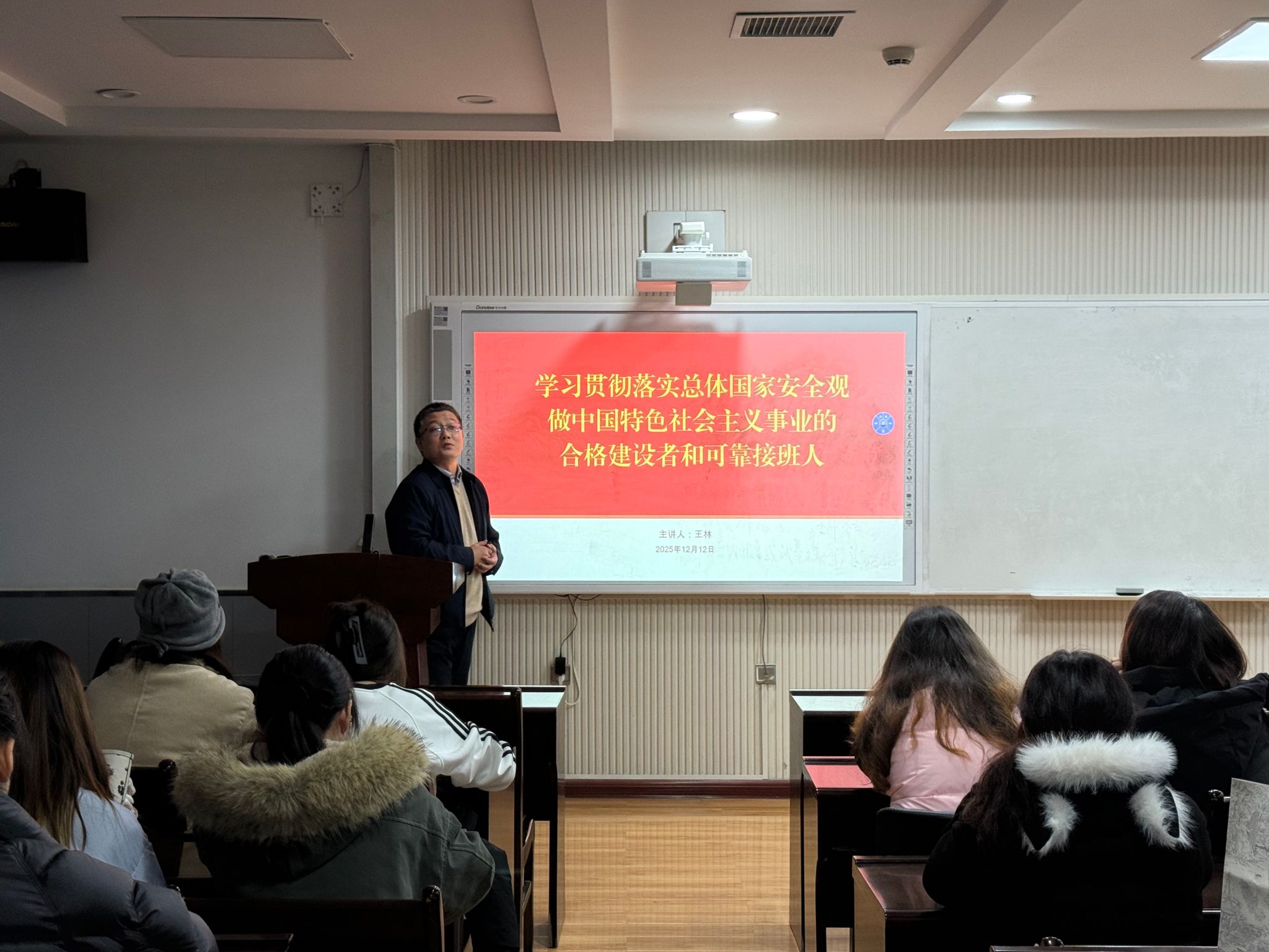 党课伊始,王林书记围绕总体国家安全观的提出背景、核心要义和丰富内涵展开系统阐述。他结合当前国际国内复杂形势,从政治安全、经济安全、文化安全、网络安全等多个维度,深入剖析了新时代维护国家安全的重要性与紧迫性。王林书记指出,总体国家安全观是新时代国家安全工作的根本遵循和行动指南,涵盖领域广泛、内涵深刻,不仅关乎国家长治久安,更与每个人的切身利益息息相关。课过程中,王林书记结合实际案例,用通俗易懂的语言将抽象的理论概念具象化,他通过分析近年来国内外发生的典型安全事件,让学员们直观感受到国家安全面临的多重挑战,深刻认识到青年一代在维护国家安全中的重要作用。同时,他强调,发展对象作为党的后备力量,必须先学一步、学深一层,不断提高政治判断力、政治领悟力、政治执行力,自觉成为国家安全的坚定维护者和积极践行者。