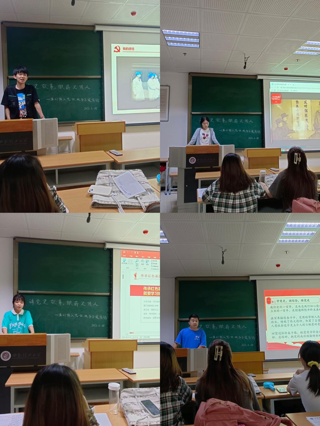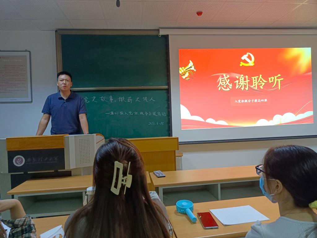 活动在提高班一班班长陈杨世梁的党史故事分享中拉开序幕。他由“赓续”的含义引出党课主题,介绍了邓稼先先生为国奉献的精彩故事,提出“稼先精神,一脉相承”,号召同学们心怀天下,胸怀梦想,为实现中华民族伟大复兴中国梦贡献出自己的力量。二班班长周凯雨则从“学党史,讲故事,悟精神,做传人”四个方面切入,强调“红色精神”是广大党员同志“补钙健体”的良药,她倡议参训学员认真学习红色故事,在知识学习中坚定发展脚步,争做薪火传人。三班班长罗天翔向同学们讲述了铁血师长陈树湘的故事,她提出要传承红色基因,学好党史中国史就必须以史为鉴,踔厉奋发,勇毅前行。四班班长董赟飞则从“红色凝聚力量,榜样引领成长”主题出发,分享了三位身边普通党员的先进事迹,并以此来激励大家从身边的小事做起,用实际行动做薪火“传承人”。任程宇最后做活动总结,他表示本次活动的目的在于通过“讲党课,明党史”的方式引导广大入党积极分子在党史故事中奋进拼搏,砺行修身,并展示学院提高班“育人于心”的课程特色,他希望同学们能在今后的学习生活中不断砥砺奋进,争取早日成为一名合格的中共党员。