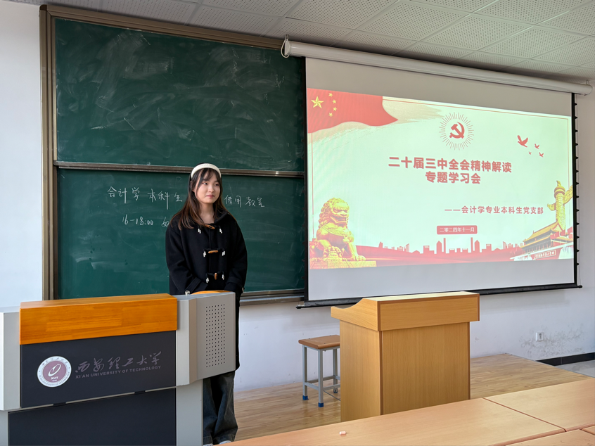 视频对全会审议通过的《中共中央关于进一步全面深化改革、推进中国式现代化的决定》等重要内容进行了深入解读,详细阐述了全面深化改革的方向、目标、原则以及在经济、社会等关键领域的改革举措,帮助同学们系统、全面地认识全会精神。支部成员李晨阳分享了自己的心得,表示作为会计学专业的学生,要将全会精神与专业学习相结合,在今后的学习中,关注经济体制改革等相关内容,深入研究财税、金融等领域的政策变化对会计行业的影响,努力提升专业素养,为经济社会发展贡献自己的力量。