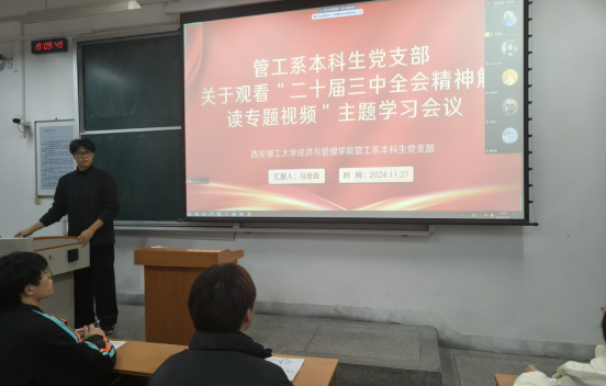 为深入学习和贯彻党的二十届三中全会精神,准确把握新时代全面深化改革的重点和方向,yl8858永利集团管工系本科生党支部于11月27日晚上在教10-217教室举办了党的二十届三中全会精神解读专题视频学习会,会议由支部副书记马培森主持。