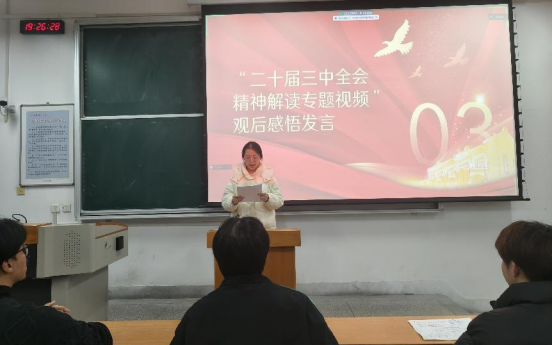 会上,马培森首先强调了学习党的二十届三中全会精神的重要性和紧迫性,他指出,党的二十届三中全会精神对推动各项事业发展具有根本性的引领作用,全体党员必须认真观看、学习专题视频,更加深入地理解全会精神内涵。随后,全体党员认真观看了党的二十届三中全会精神解读专题视频,视频从多个角度对党的二十届三中全会精神进行了深度解读,党员们全神贯注,认真做好笔记。观看结束后,支部党员进行了交流讨论,分享心得体会。最后,马培森总结了会议的主要内容和收获,并强调了下一步学习计划。他要求全体党员要继续深入学习党的二十届三中全会精神,紧密结合自身实际,将学习成果转化为实际行动,为推动学校发展、服务国家战略贡献智慧和力量。