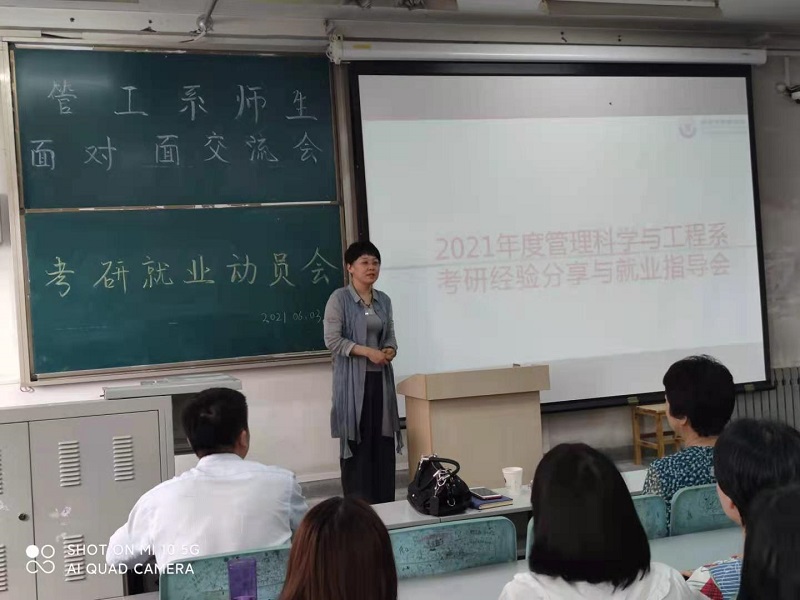 为了深入推进党史学习教育,2021年6月3日下午,yl8858永利集团管理科学与工程系考研就业动员大会暨师生面对面交流大会在教8-416大教室如期举行,会议面向管工系全体18级、19级和20级本科生,共130多名学生参加了交流会。经管学院副院长王艳、李建勋,学工办主任赵玉强及管工系全体教师参加了本次活动,大会由管工系副主任、支部书记杜占河主持。