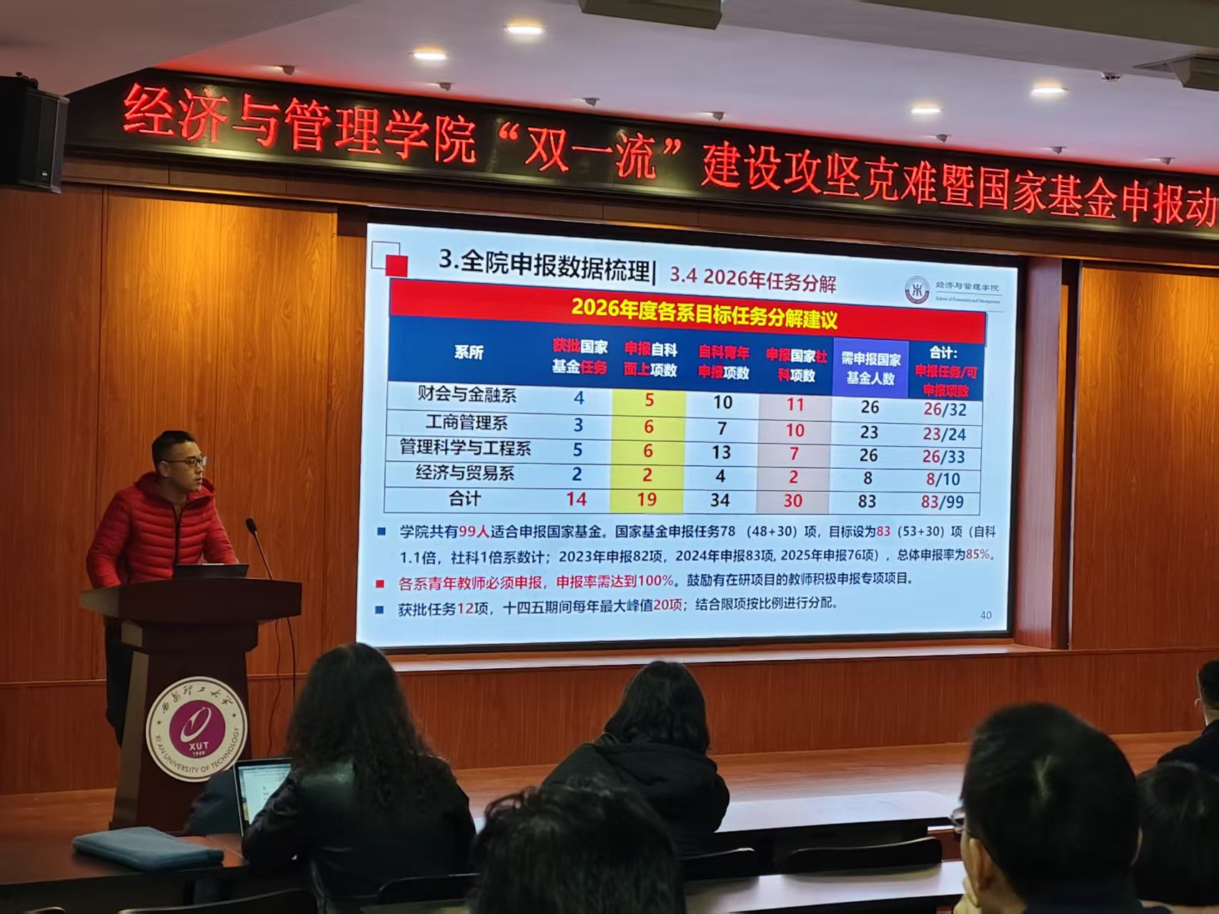 随后,赵璟副院长结合教师职称、基金类别、所属系别等维度,对全院申报潜力进行系统梳理,明确各系 2026 年度国家基金申报任务指标。他鼓励全体教师尽早启动申报准备,精准把握选题方向,以系所为单位开展协同化申报与精细化评审;学院将在后续工作中持续强化科研辅导、提供个性化评审服务,并建立常态化督促推进机制,为教师申报提供全流程保障。