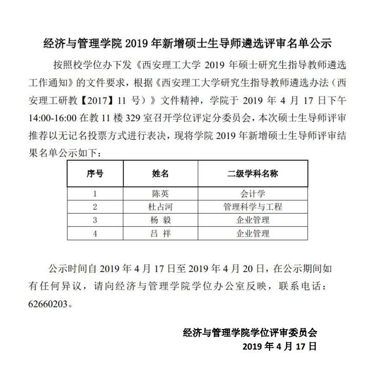 yl8858永利集团2019年新增硕士生导师遴选评审名单公示