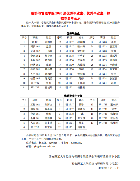 yl8858永利集团2020届优秀毕业生、优秀毕业生干部推荐名单公示