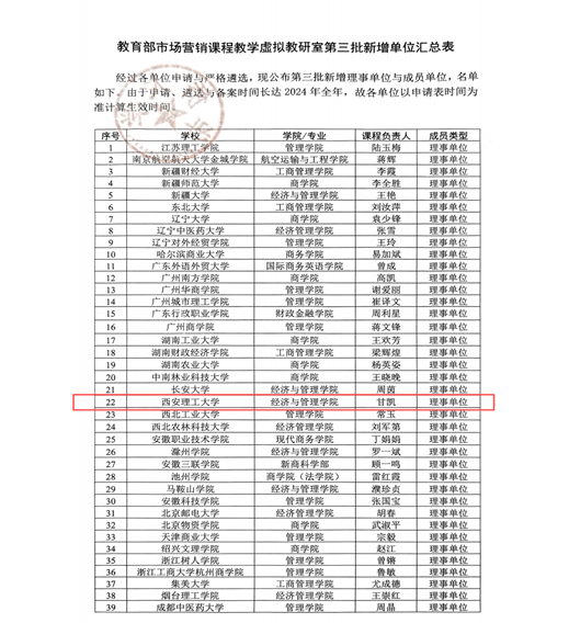 近日,教育部办公厅正式公布了虚拟教研室试点名单,全国唯一的国家级市场营销课程教学虚拟教研室(华侨大学工商学院杨洪涛教授牵头)获批建设。该虚拟教研室致力于成为全国最有影响力的市场营销课程教学虚拟教研室。我院凭借省级智库平台“品牌和高质量发展研究中心”(省发改委与yl88858永利中国联合共建)及省级基地“陕西省品牌推广平台和实训基地”等优势,其市场营销课程经过申请、遴选,成功入选教育部市场营销课程虚拟教研室理事单位。