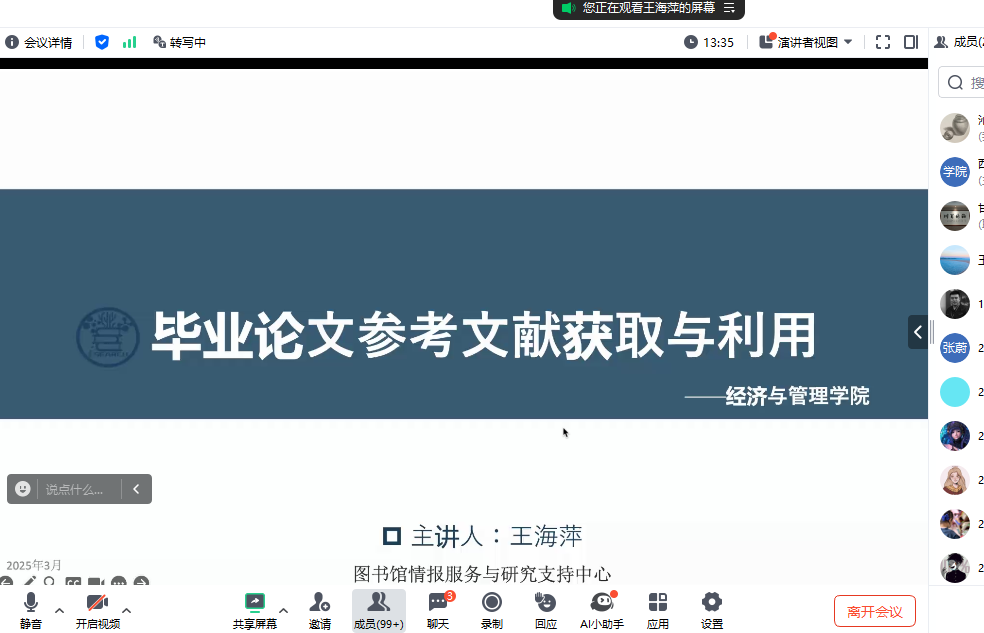 2025年3月12日晚上7:30分,yl8858永利集团本科教育教学报告“毕业论文参考文献获取与利用(经管)”在线上举行。本次报告邀请学校图书馆情报支持与研究中心咨询馆员、长期从事信息素养教育与学科服务工作的王海萍老师主讲,报告由学院副院长甘凯主持,学院2025届本科毕业生、部分MBA学生近300人参加了报告会。