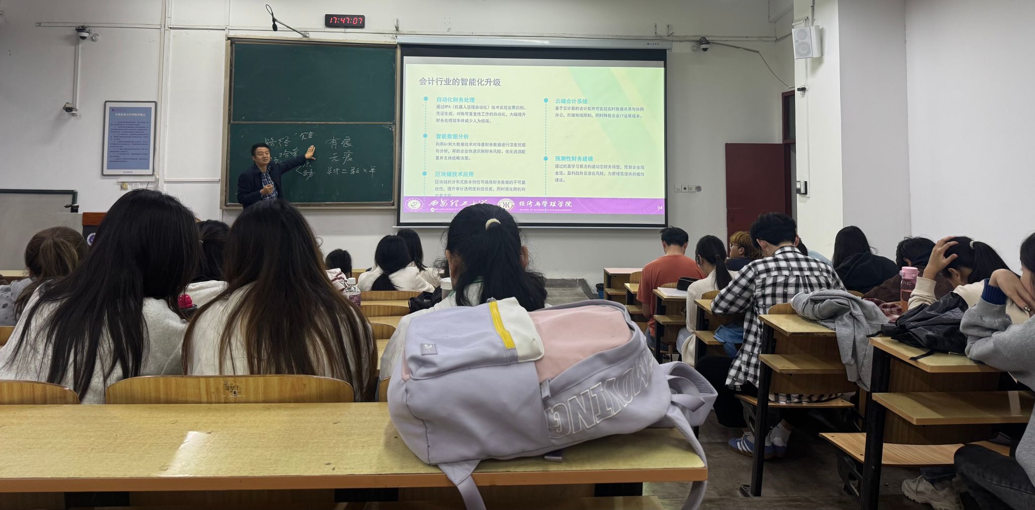 讲座中,吴溥峰副教授详细阐述了数智技术的概念,并结合当前数字化转型背景,探讨了技术如何重塑传统会计行业的工作模式与职业前景。他以生动的案例为基础,剖析了数据智能化如何提升会计专业的工作效率与精准度,为学生们描绘了会计专业的未来蓝图。